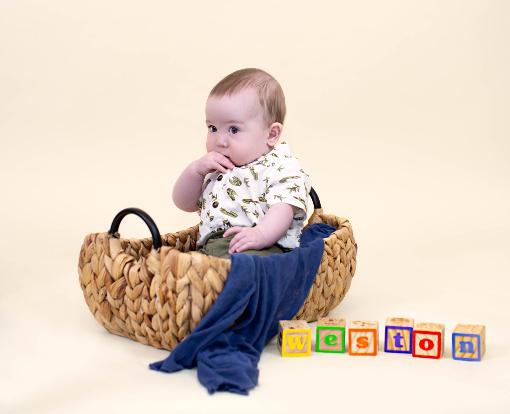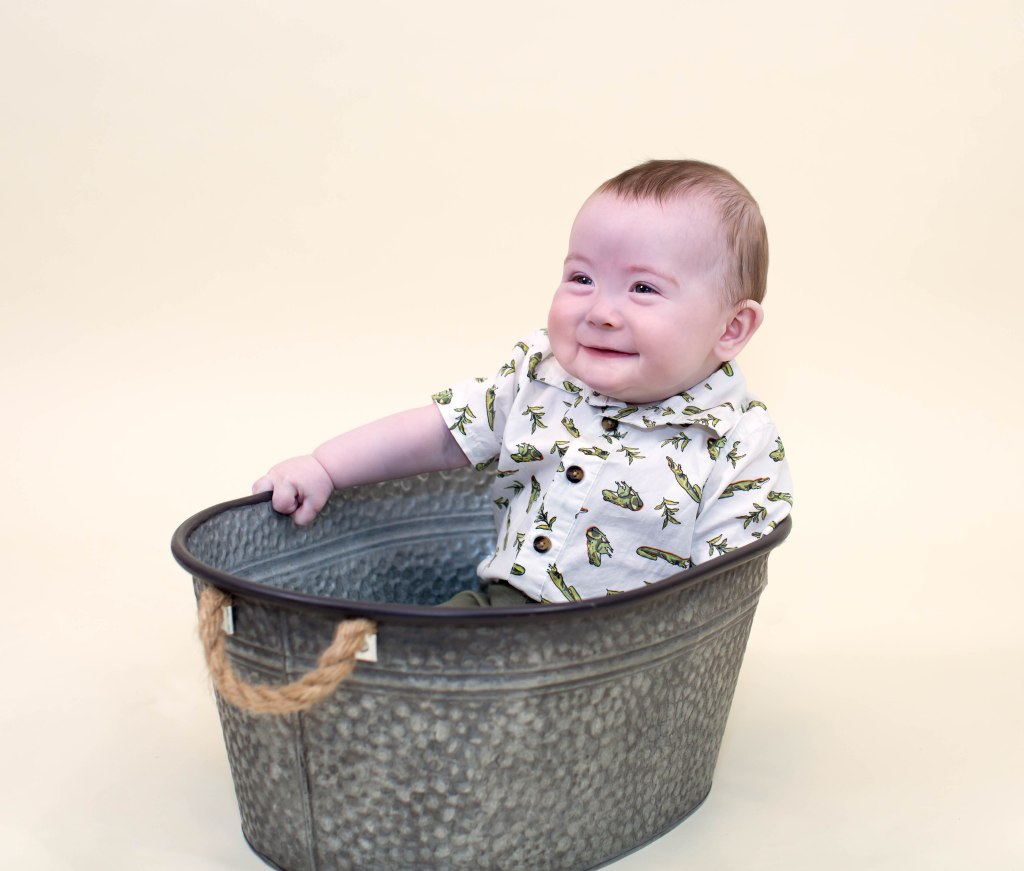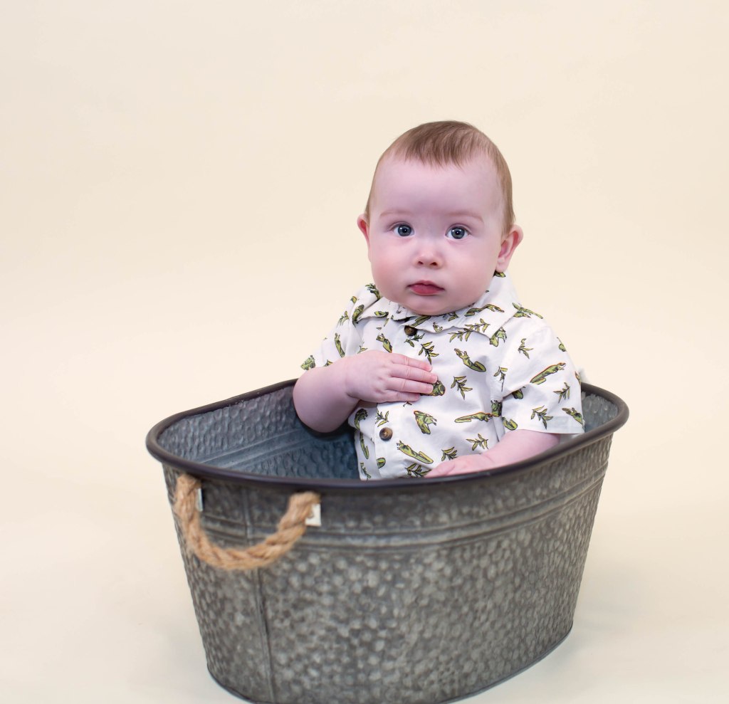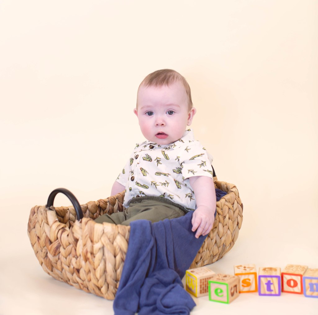 Well….I won’t tell how many times it took to get a few pictures of Weston for his six month photoshoot. He was not having it!!!. He did not like any of the buckets because he is not sitting up completely by himself yet. Eventually I was able to get a few to mark his 1/2 birthday! We love you little man!